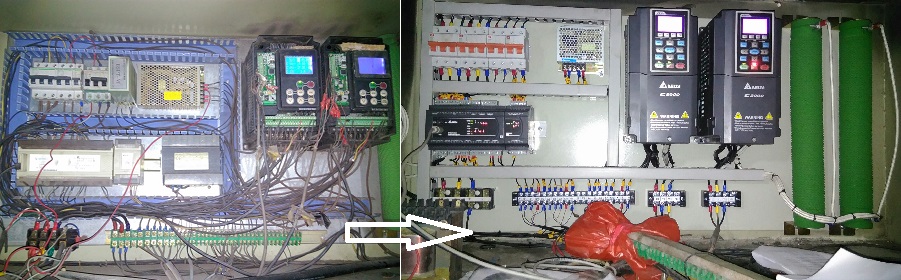 Khắc phục nhược điểm trên chúng tôi cung cấp thay thế,lập trình toàn bộ thiết bị điện trong tủ điện.Hệ điều khiển mới sử dụng đồng bộ thiết bị điều khiển của hãng Delta Đài Loan, ưu điểm là thiết bị rất phổ biến trên thị trường nên dễ dàng thay thế thiết bị,cải tiến, nâng cấp và vận hành dễ dang cài đặt,update thông số...